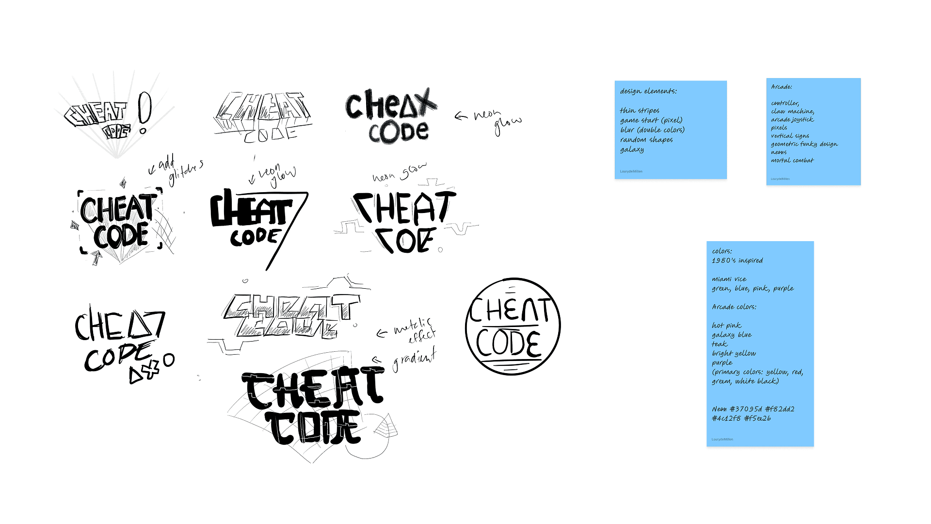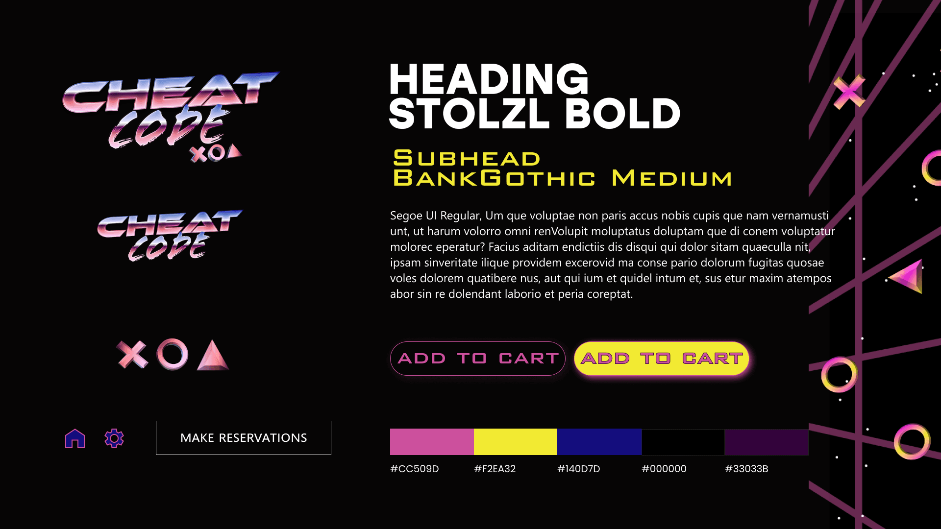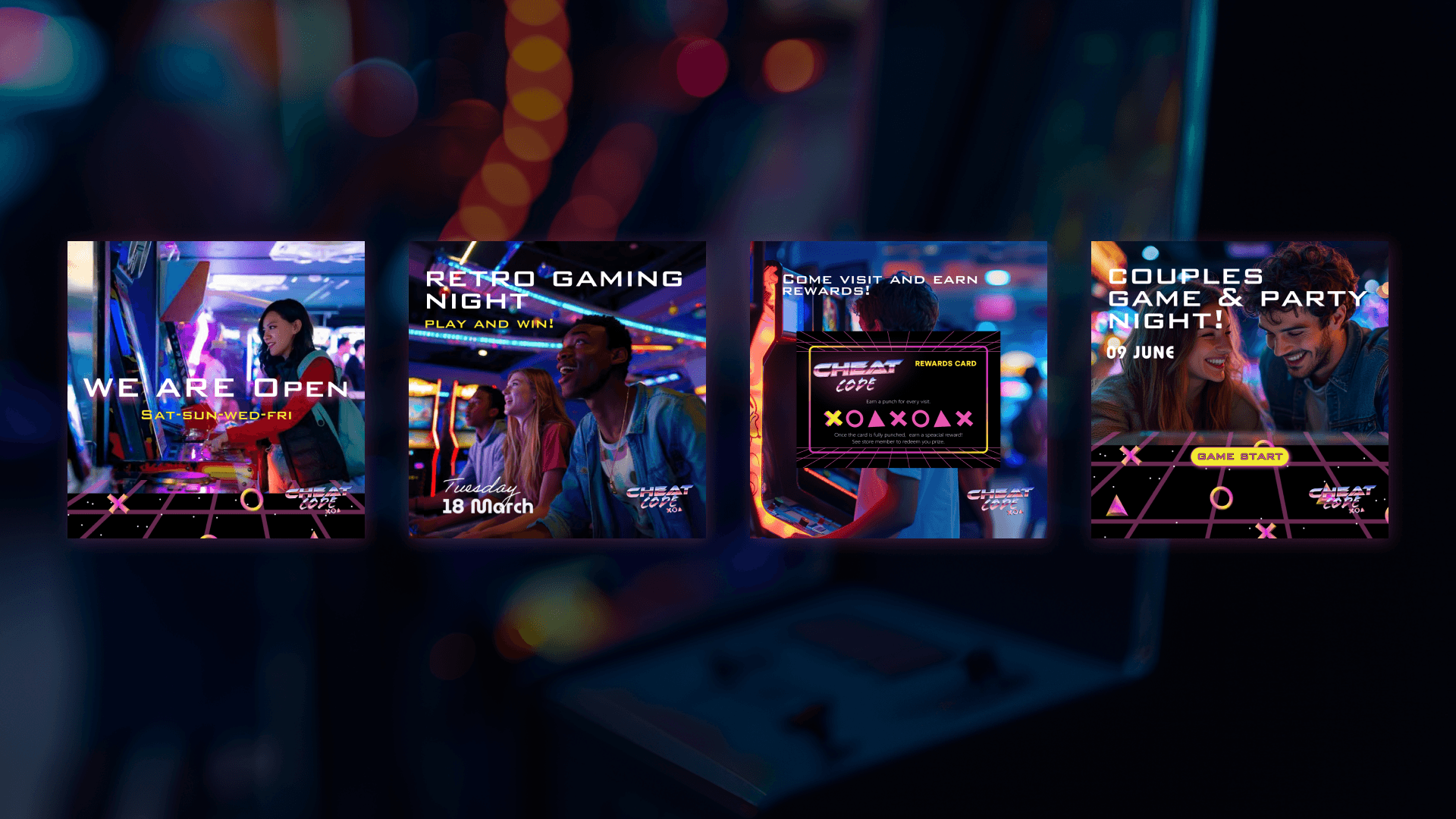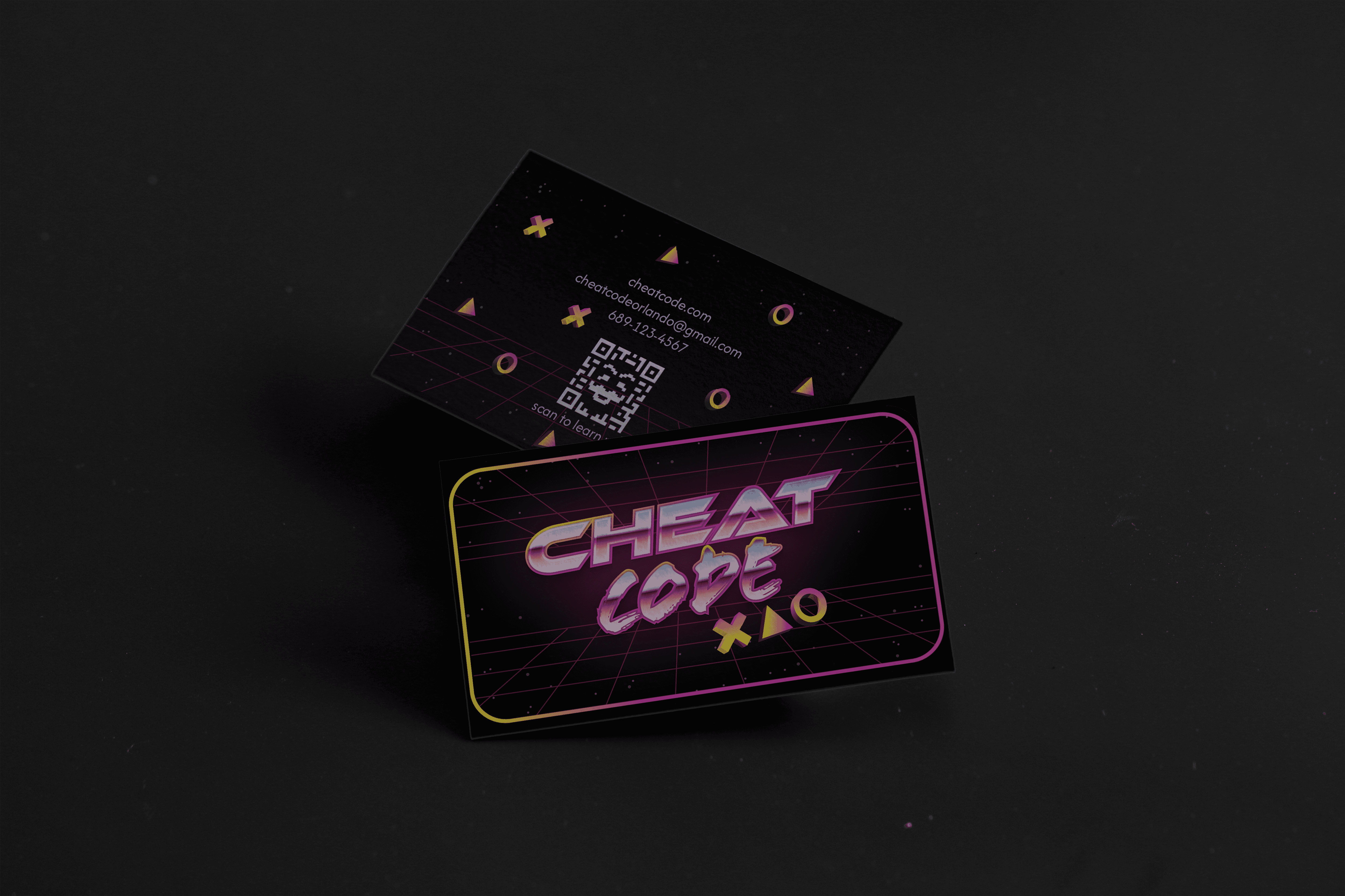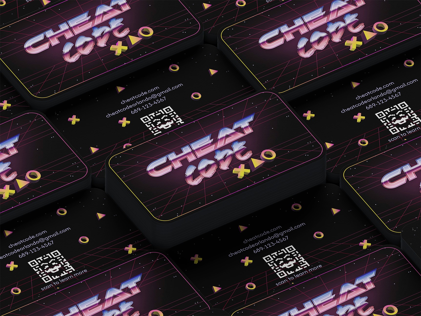 Cheat Code is a fictional video arcade concept brought to life through bold, era-specific branding inspired by the 1980s golden age of roller rinks and dance clubs. The objective was to develop a cohesive visual identity using iconic elements such as neon lighting, retro gradients, and geometric iconography.