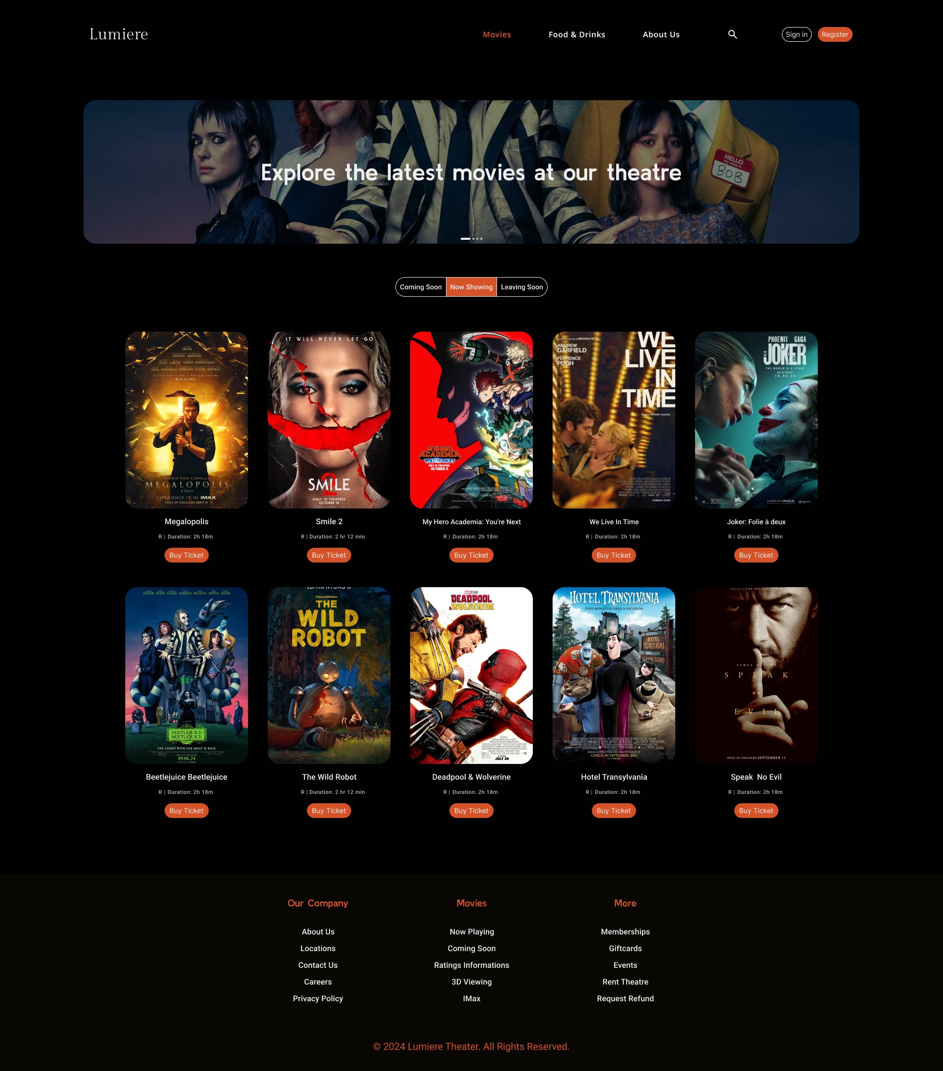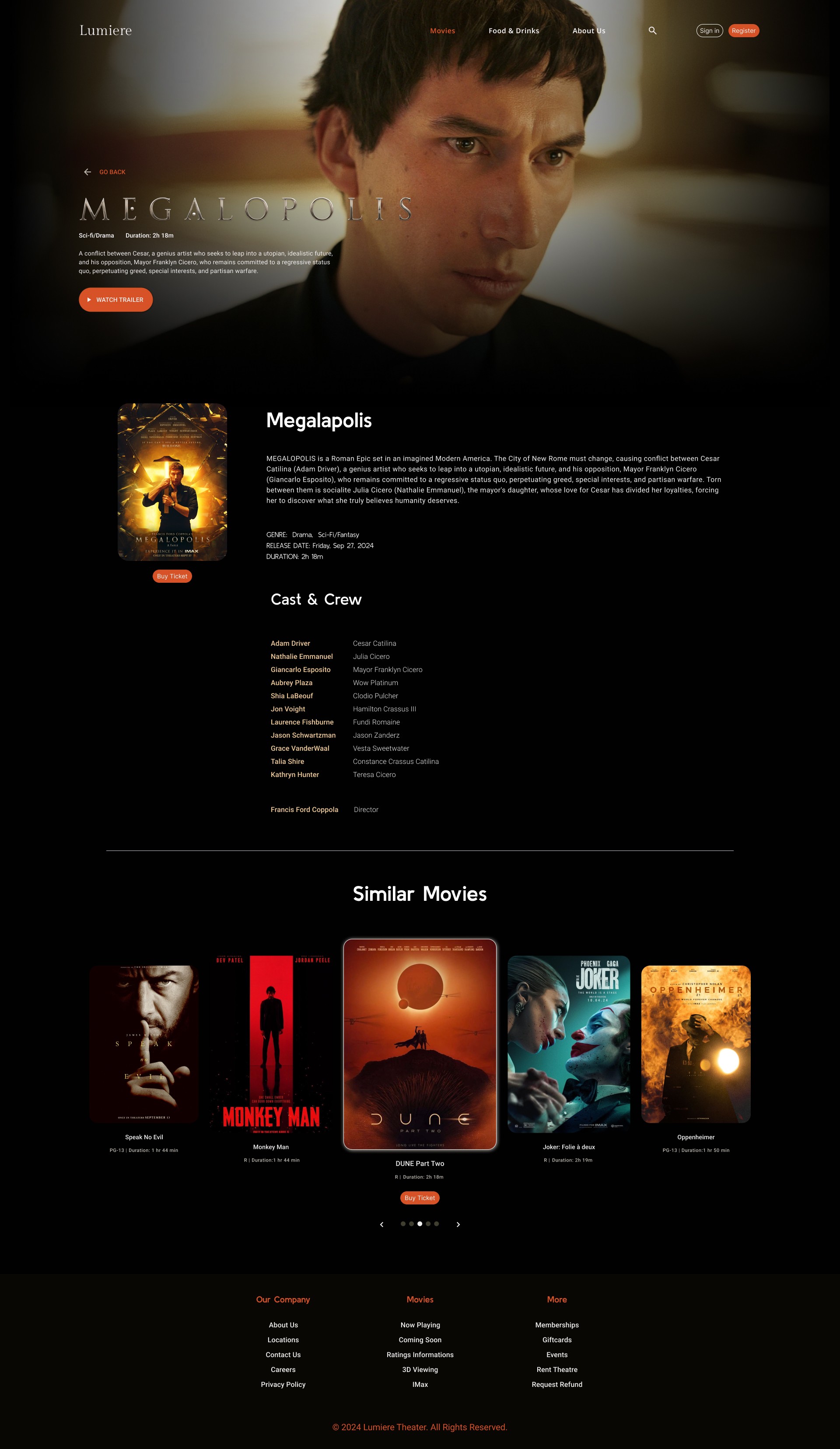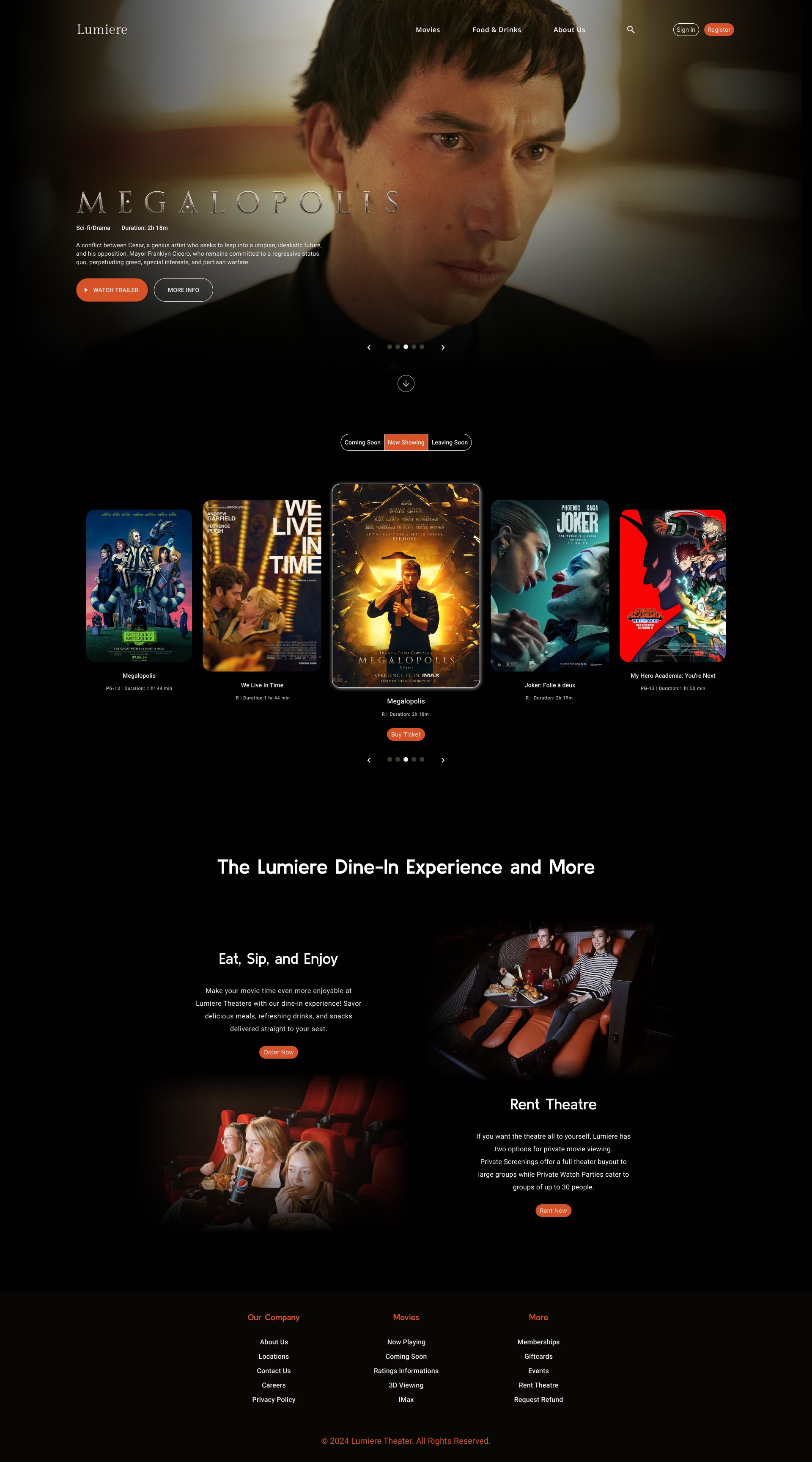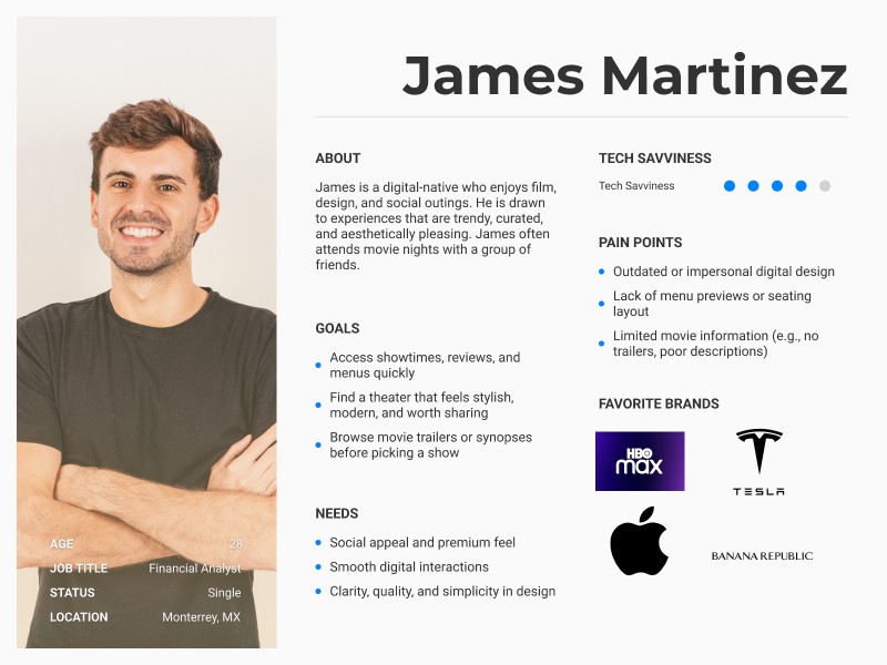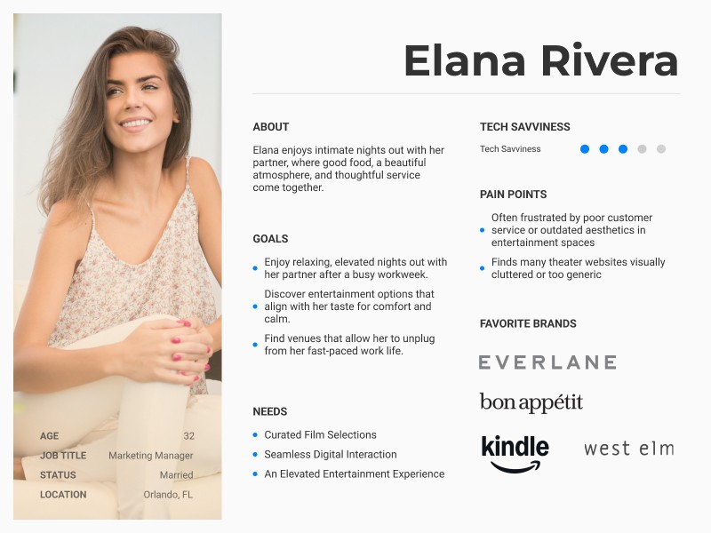 Lumière’s primary audience consists of young professionals, couples, and social groups who value immersive, comfortable entertainment paired with elevated dining. These moviegoers are drawn to experiences that feel exclusive and thoughtfully curated. They expect a seamless and refined digital browsing experience that mirrors the theater’s upscale brand and enhances their decision-making process—from exploring showtimes to reserving premium seats.