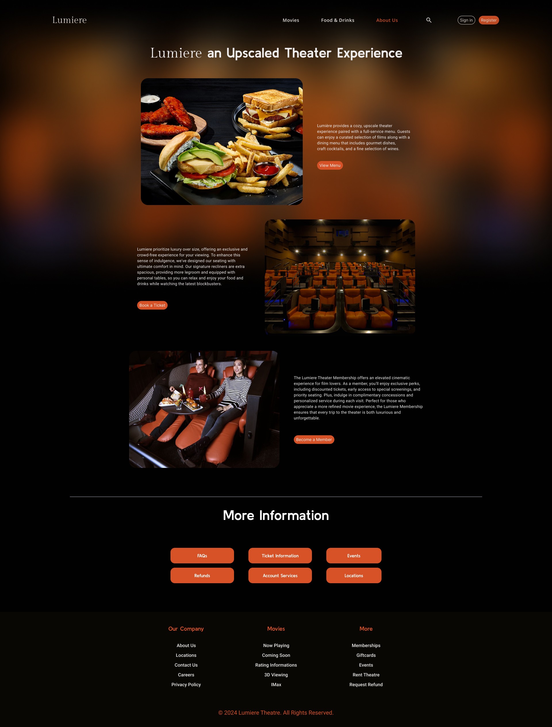 Showcase premium amenities through photography, icons, and concise copy to showcase Lumière Theater’s upscale features.