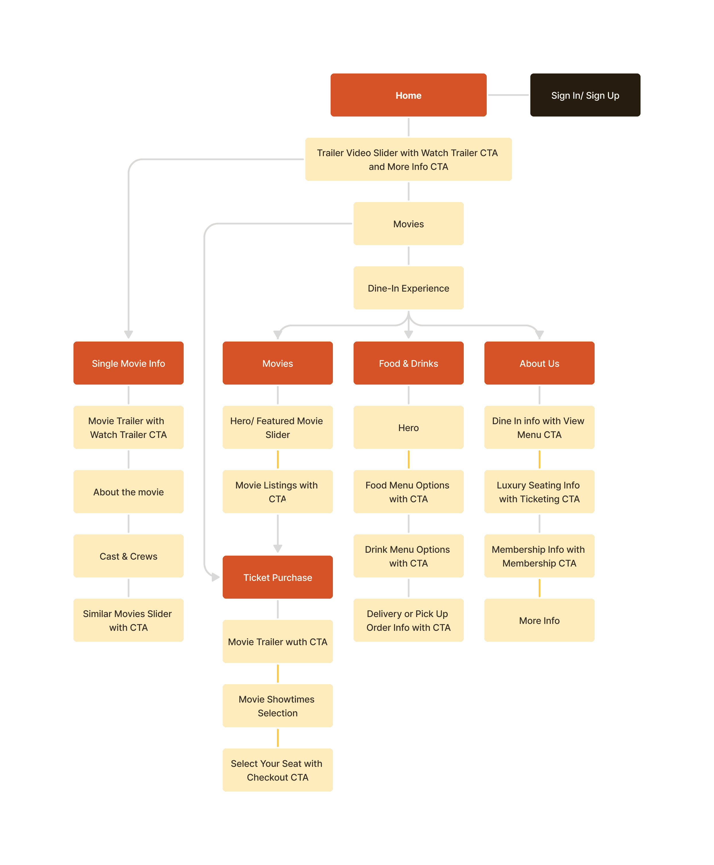 We consolidated our research into detailed user personas, which gave us valuable insight into the different types of people seeking an upscale theater experience. Using these personas, we developed an information architecture for the site to ensure the content and structure align with our users’ needs. This process helped us identify key content areas and features based on the user research.